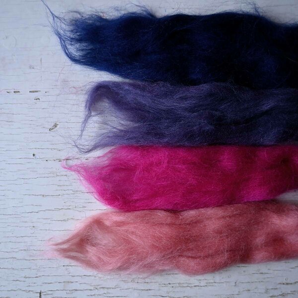 A set of four colours of Corriedale top, 50 grams each. A set of four colours of Corriedale top, 50 grams each.
